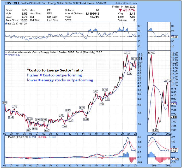 For example, after a massive period of outperformance, Costco stock has been underperforming energy stocks since autumn 2020. This chart shows the ratio of Costco to the energy sector, and we can see that the ratio is getting rather heavy around high levels: