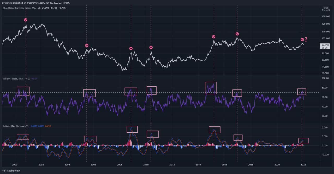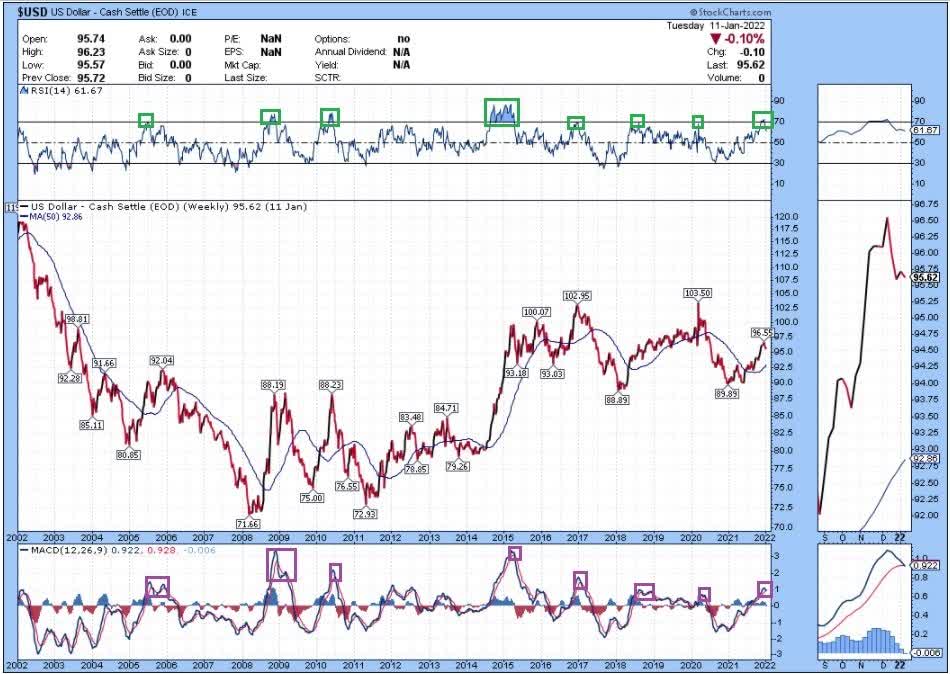 The Dollar on WatchThe dollar index, which tracks the US dollar compared to a basket of major foreign currencies, gave a warning sign last week. Historically, when the dollar index becomes overbought on the weekly chart (green boxes in the chart below), and then rolls over into negative momentum (purple boxes in the chart below), that often leads to a significant decline in the dollar index after that point: