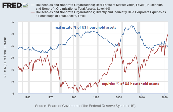 US households now have record high allocations to equities, from a combination of inflows and valuation increases. The red line in the chart below is US household equity exposure (currently 29% of total assets) and the blue line is US household real estate exposure (currently 25% of total assets):