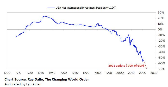 That’s what the United States is doing with the rest of the world with its productive assets as it goes deeper and deeper into a negative net international investment position.