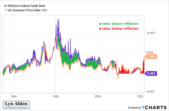 And this next chart shows the federal funds rate compared to headline price inflation. Short-term yields have spent most of the past twelve years below the prevailing inflation rate, meaning that bank accounts and Treasury bills have gradually lost purchasing power over time: