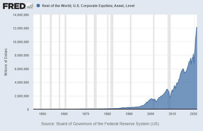 The chart is parabolic with very large numbers, so perhaps it helps to explain it in percentage terms instead. At the end of World War II, the rest of the world owned about 2.6% of non-bank US corporate equities. About three decades later when the petrodollar system began in the mid-1970s, the foreign sector owned about 4.3% of non-bank US corporate equities. So, the percentage increased moderately from a low base before this system was put in place. Then, from the mid-1970s into 2021, this percentage rapidly increased, and the foreign sector now owns about 25% of non-bank US corporate equities.