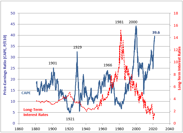 This chart shows 10-year Treasury yields in red compared to the cyclically-adjusted price/earnings ratio of the S&P 500 in blue: