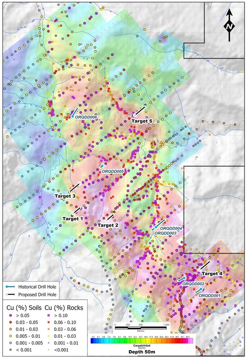 Figure 1: Plan map of Orquideas with planned holes and previous drilling (CNW Group/Luminex Resources Corp.) The total planned drill program will consist of 2,500 metres across five holes (see Figure 1 for Targets 1-5). The targets represent a mix of geological, geochemical and geophysical anomalies. Host rock alteration and structure, as interpreted through geological mapping and geophysical contrasts and characteristics, also played a role in target selection. Overlapping of multiple anomaly types was key in identifying and prioritizing areas for drill testing. The Companies' geologists believe that porphyry intrusions are at the core of the targeted anomalies.