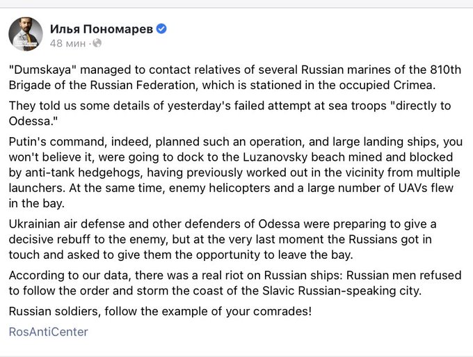 Last night a large group of RU warships was about to launch landing on Odesa beaches. They approached the coast. RU was about to shell the beach. UA was about to shoot back, when they suddenly withdrew. Reports that marines from Crimea refused to attack Odesa.