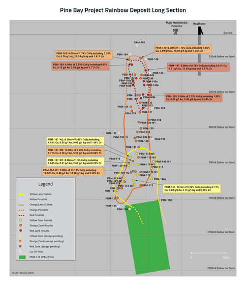 Pine Bay Project Rainbow Deposit Long Section March 2022 (CNW Group/Callinex Mines Inc.) PBM-161-W1 intersected the Orange Zone and returned 9.0m of 12.53% copper ("Cu"), 0.21 g/t gold ("Au"), 2.63 g/t silver ("Ag"), 0.25% zinc ("Zn") or 13.19% copper equivalent ("CuEq") including 5.50m of 17.37% Cu ( Rainbow Deposit Long Section). The Orange Zone in PBM-161-W1 was preceded by an intercept in the Yellow Zone that returned 8.00m of 1.90% CuEq (1.6.% Cu, 0.21 g/t Au, 2.63 g/t Ag and 0.25% Zn). The Orange Zone intersection in PBM-161-W1 is located 20m vertically above and along strike to the north of PBM-129-W2 which intersected 13.0m of 8.75% Cu (Orange Zone) and a 41m step-out to the south from PBM-113-W1 which intersected 5.00m of 8.79% Cu (Orange Zone).