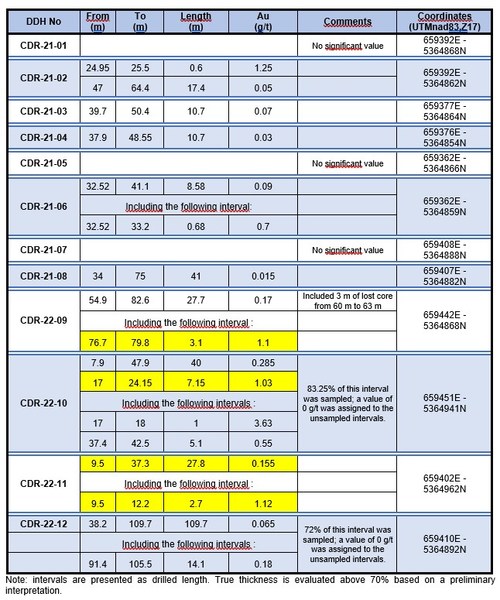 Gold enrichment was locally obtained within this program with 1.1 g/t over 3.0 m in hole CDR–22–09, 1.0 g/t over 7.2 m (including 1 m at 3.6 g/t) from hole CDR–22–10 and 1.1 g/t over 2.7 m in hole CDR–22–11. See the table for details of gold intervals.