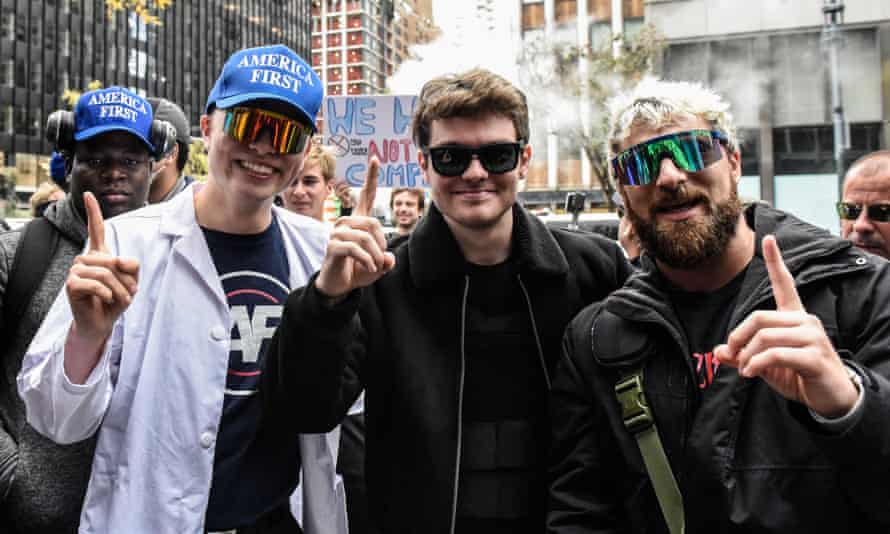 Nicholas Fuentes flanked by anti-vaccine protesters at a demonstration in New York. Photograph: Stephanie Keith/Getty Images“