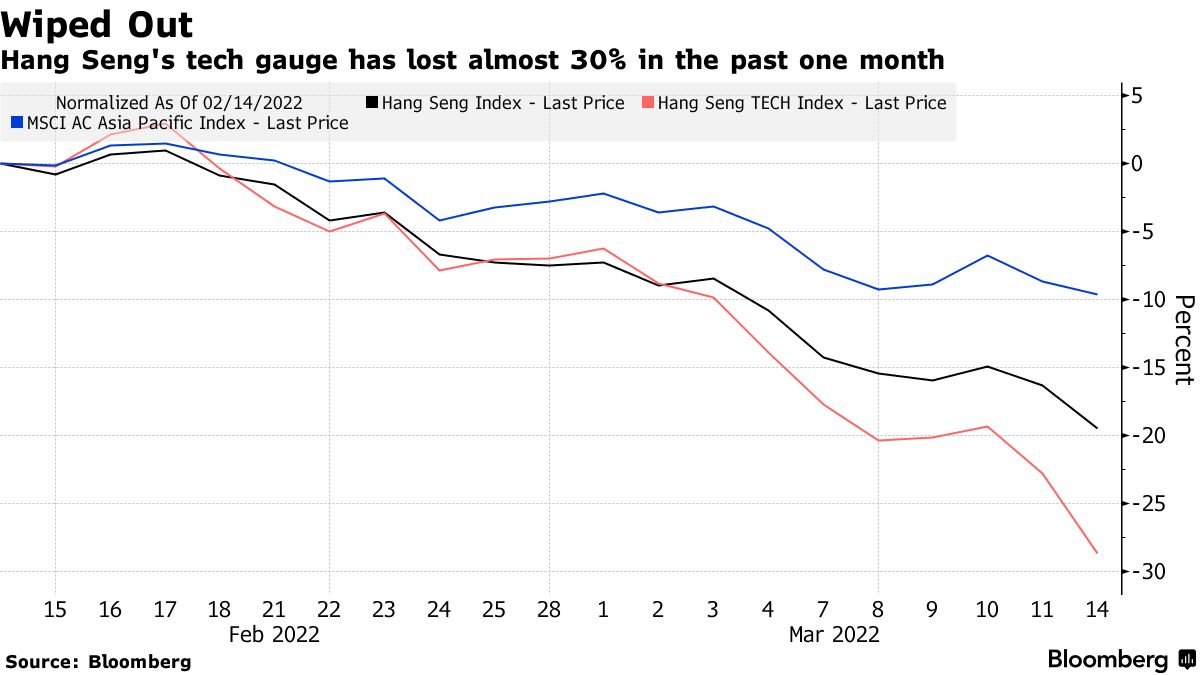 The broad rout follows a report citing U.S. officials that Russia has asked China for military assistance for its war in Ukraine. Even as China denied the report, traders worry that Beijing’s potential overture toward Vladimir Putin could bring a global backlash against Chinese firms, even sanctions. Sentiment was also hurt by a Covid-induced lockdown in the southern city of Shenzhen, a key tech hub, and the northern province of Jilin.