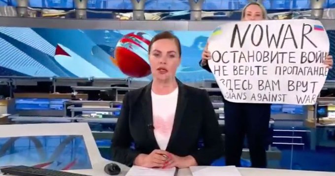 On Monday in Moscow, an employee of the popular state-owned television station Channel One charged onto its nightly news broadcast to protest Russia’s invasion of Ukraine. Marina Ovsyannikova, an editor for the network, appeared behind anchor Ekaterina Andreeva with a sign that read “NO WAR” in English. She told the audience that the state-controlled media was “lying to you” and called for an end to the war: