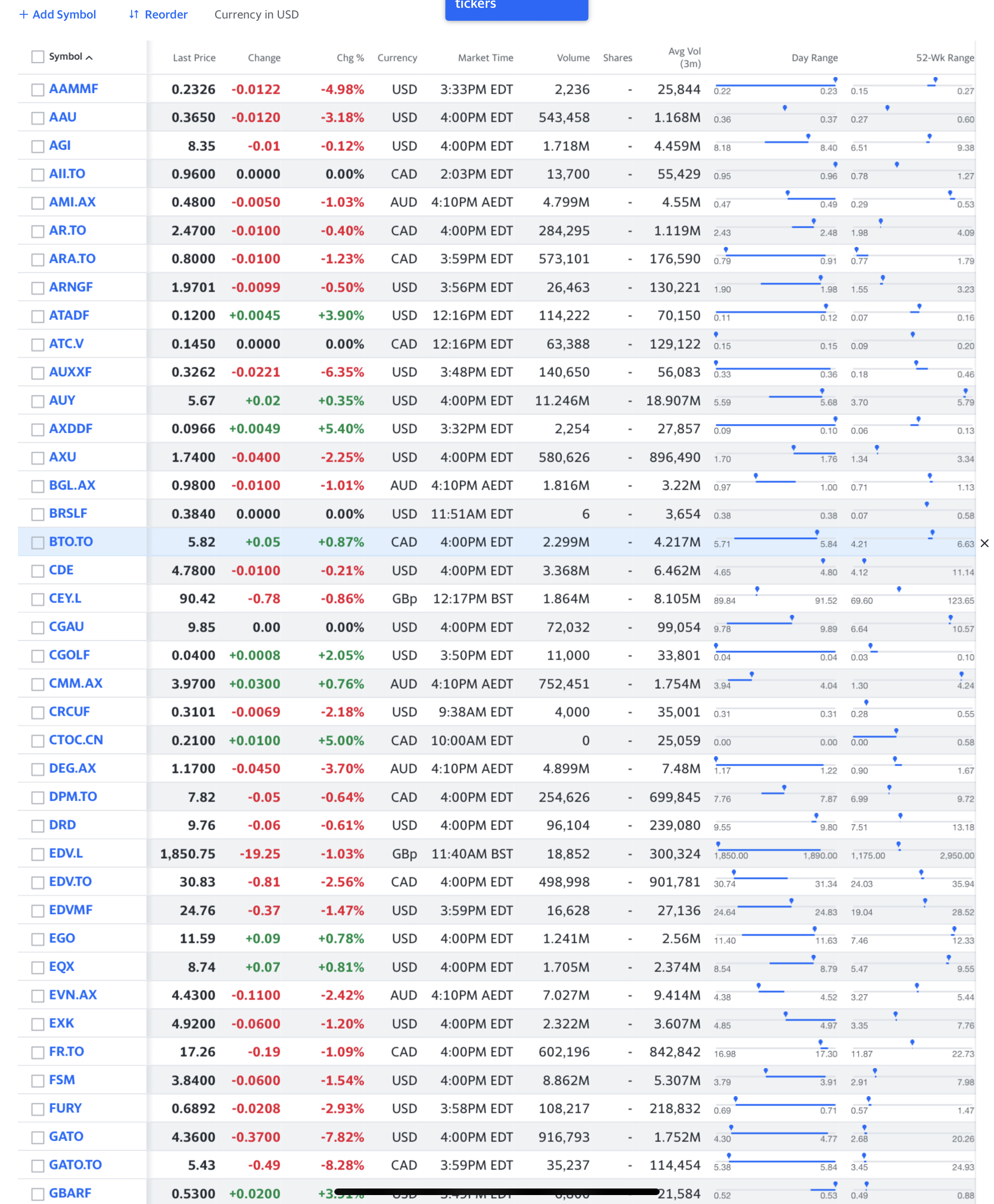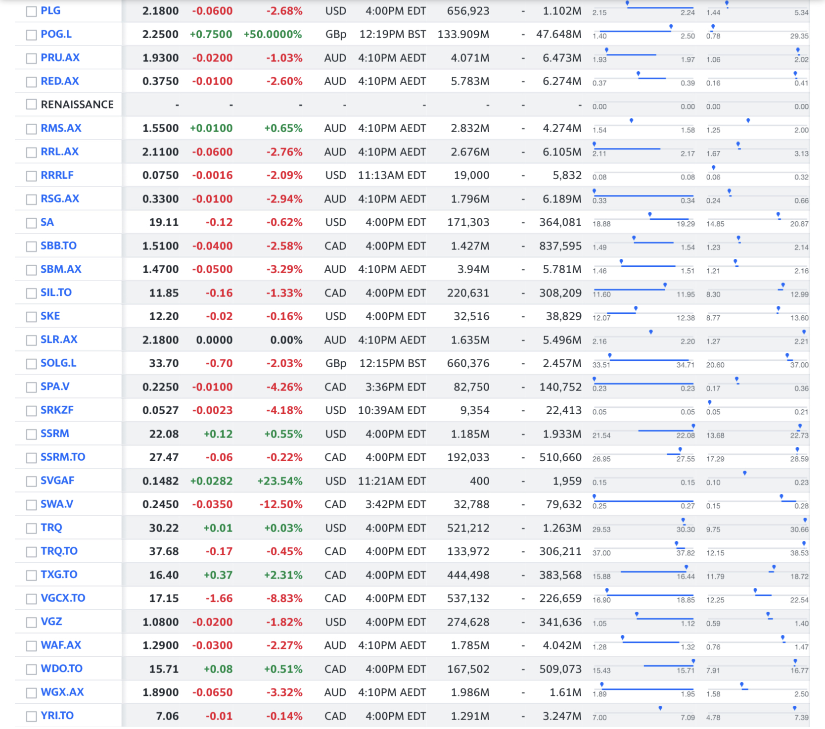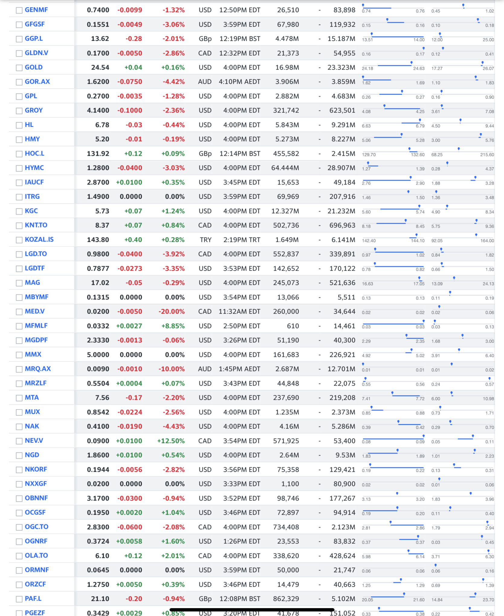 The list looks so now, and shall get intern to take a crack on organizing the mess by type of company (exploration / operation / royalty / tailing), market cap, geographic location of mine / claim, reserve, resource, debt, 24-months hi- / lo-, chart, cash runway, whether included in any ETF, institution holdings, insider holdings, anecdotal whatever, … what else?