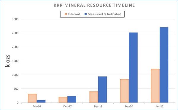 At January 31, 2022, Measured and Indicated Gold Mineral Resources at Higginsville totaled 31.71 million tonnes grading 1.6 g/t for 1,587,000 ounces, an increase of 121,000 ounces, or 8%, compared to the September 30, 2020 Measured and Indicated Resource of 1,466,000 ounces. This increase mainly reflects a successful drilling campaign which supported the upgrade of the Historical Spargos Mineral Resource into Karora's Consolidated Mineral Resource. At January 31, 2022, Inferred Mineral Resources totaled 6.37 million tonnes grading 2.1 g/t for 428,000 gold ounces, an increase of 118,000 ounces, from the September 2020 Inferred Mineral Resource estimate of 310,000 ounces. The consolidated Higginsville Mineral Resource is net of mine production depletion of 0.6 million tonnes grading 2.1 g/t for 41,000 ounces over the period October 1, 2020 to January 31, 2022.