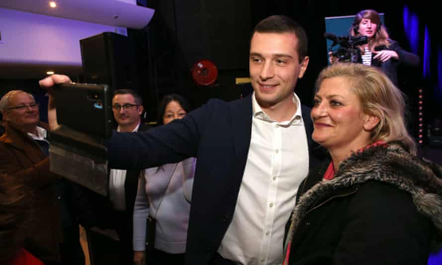 Jordan Bardella takes a selfie with Le Pen supporters at a March meeting in Cogolin, southern France. Photograph: Alain ROBERT/SIPA/REX/Shutterstock