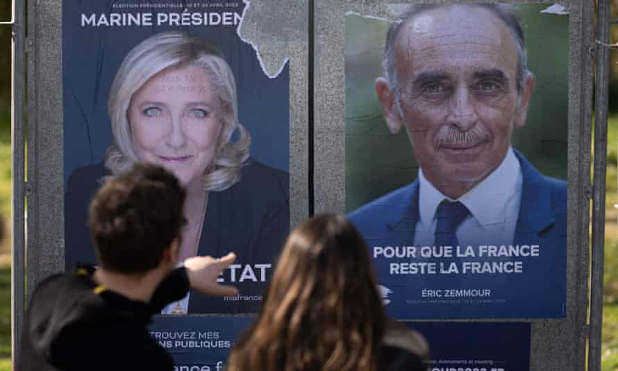 Election campaign posters for Marine Le Pen and Eric Zemmour in Montaigu, western France. Photograph: Loïc Venance/AFP/Getty Images