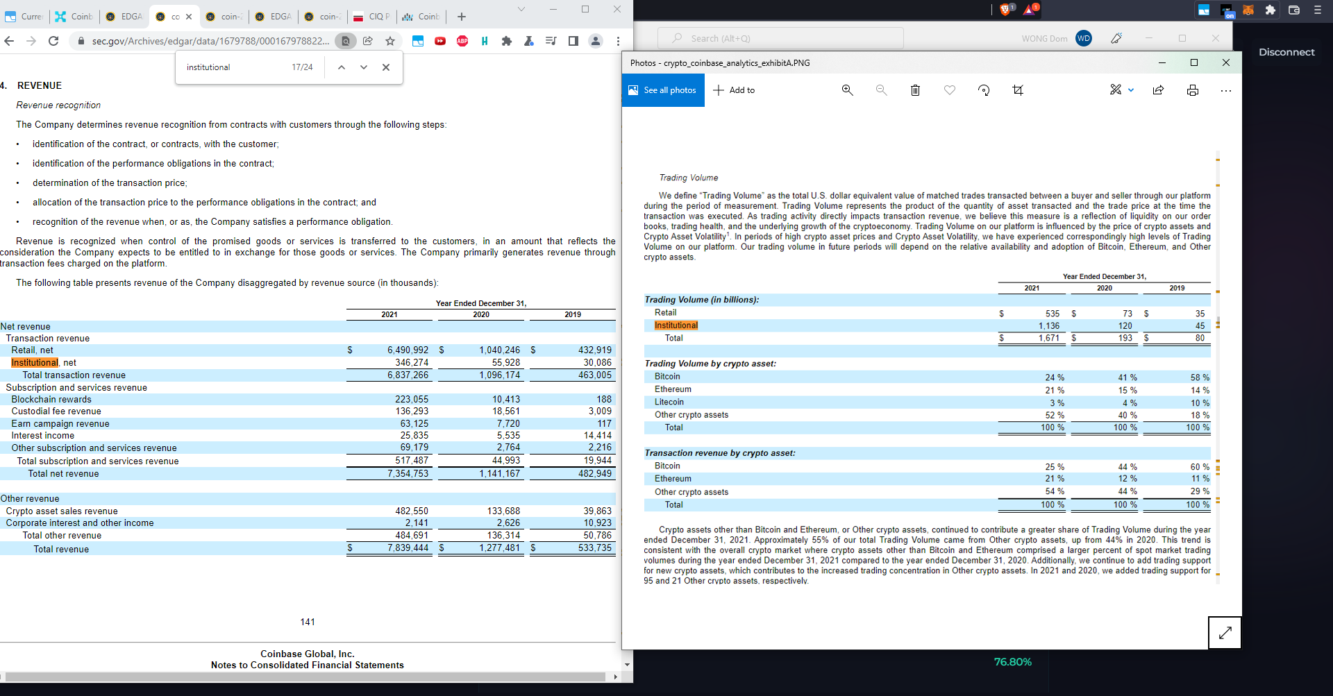 I have some speculations about Coinbase's future revenues. There is something interesting to note about how they make money. See how the majority of volume comes from institutional traders, while the majority of the revenue stems from the retail clients themselves. This leads to a perhaps self-evident fact that institutional teams are the ones doing the most volume, thus have the most impact to the price and momentum, and the bill is picked up by retail consumers of crypto, typically the everyday investor. In a normal enviourment, the big boys don't trade and lose money, the small retail investors do. So with the diminished trading volume and participation from retail investors, it doesn't look good at all for investors of Coinbase.