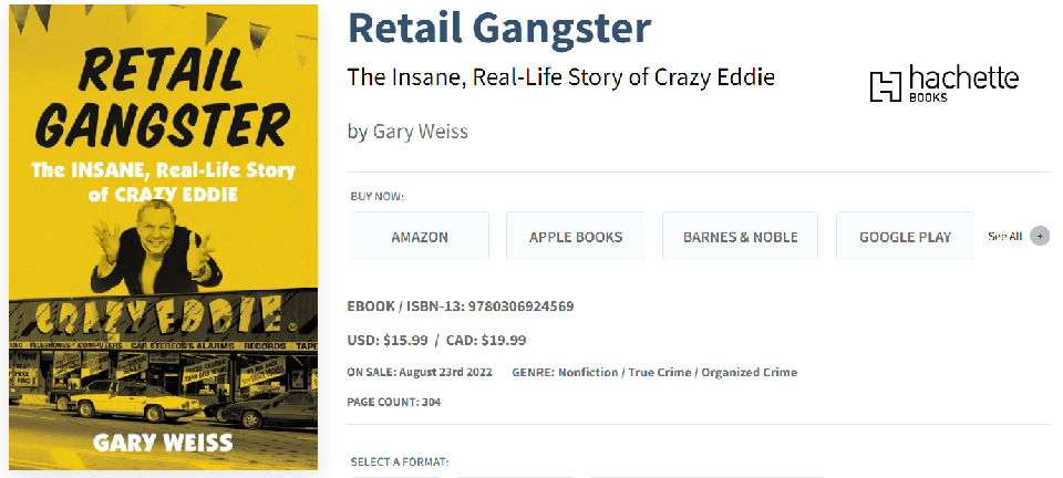 Many years have passed since the franchise went down in spectacular fashion but Crazy Eddie's moment has endured the way that iconic brands and characters do–one only need Google the media outpouring that accompanied his death. Maybe it's because it crystallized everything about 1970s New York almost perfectly, the merchandise and rise of consumer electronics (stereos!), the ads (cheesy!), the money (cash!). In Retail Gangster, investigative journalist Gary Weiss takes readers behind the scenes of one of the most unbelievable business scam stories of all time, a story spanning continents and generations, reaffirming the old adage that the truth is often stranger than fiction.