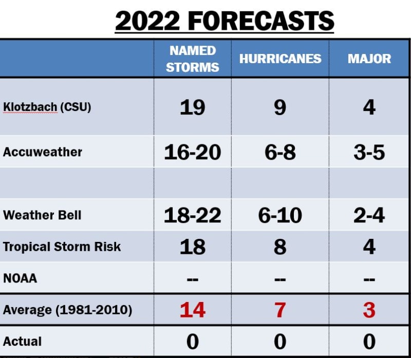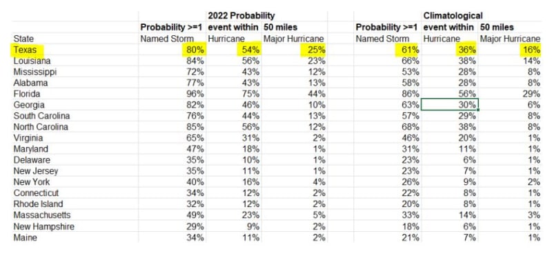 =1 named storm, hurricane and major hurricane tracking within 50 miles of each coastal state from Texas to Maine. Probabilities are provided for both the 1880–2020 climatological average as well as the probability for 2022, based on the latest CSU seasonal hurricane forecast." loading="lazy" class="c008" style="margin-block: 0px; margin-inline: 0px; height: auto; display: block; max-width: 100%; margin-top: 1.0964rem; max-height: 50%; break-inside: avoid-column;"> Probability of >=1 named storm, hurricane and major hurricane tracking within 50 miles of each coastal state from Texas to Maine. Probabilities are provided for both the 1880–2020 climatological average as well as the probability for 2022, based on the latest CSU seasonal hurricane forecast.You can read the full report from Colorado State University’s Tropical Meteorology Project right here.