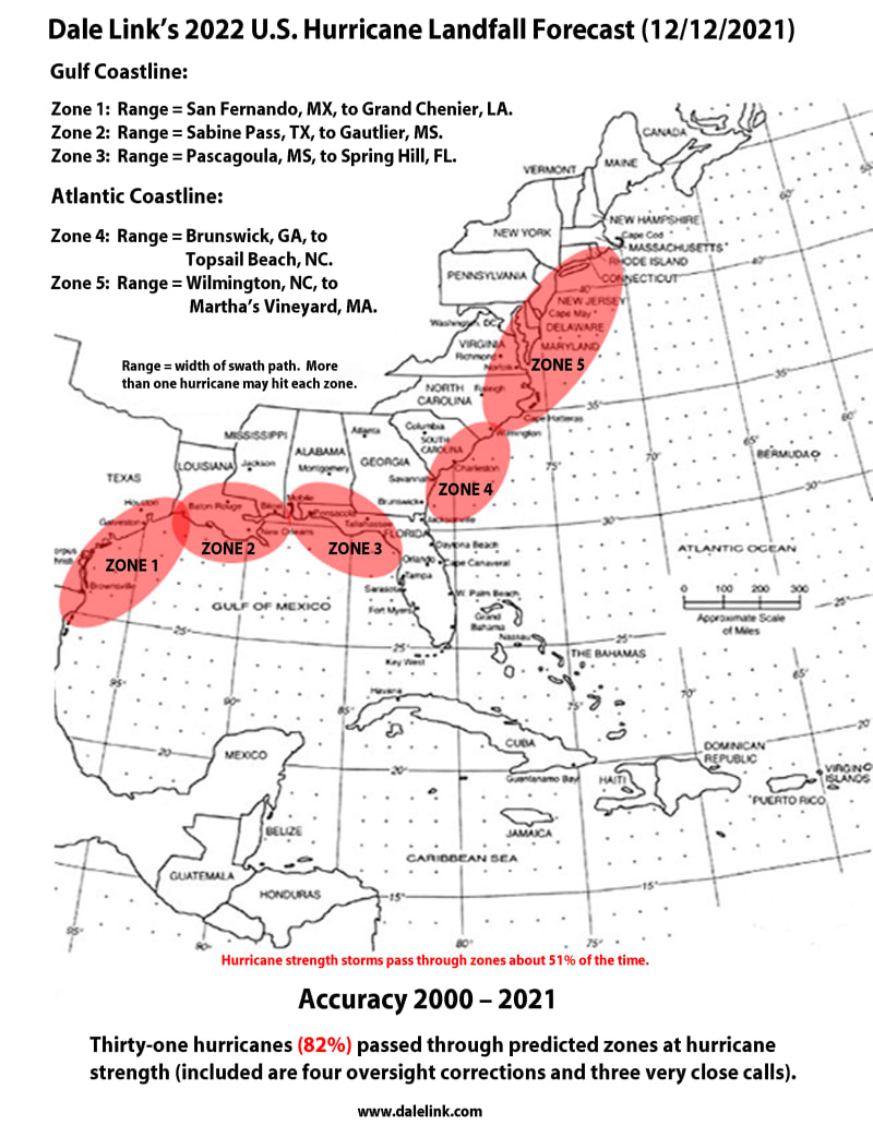 The red zones are areas where Dale Link predicts a hurricane will make landfall this coming seasonLink claims an 82% accuracy rate noting “oversight corrections and very close calls”. A couple of interesting notes: in 2009 and 2015 Dale Link forecasted that the US would have no hurricane hits. In 2009, two minimal storms (TS Claudette and Ida) did strike the Central Gulf coast causing minimal damage. In 2015, Tropical Storms Ana and Bill both made a US landfall but neither were hurricanes. Still, to predict zero landfalls in both years and have minimal action is impressive.