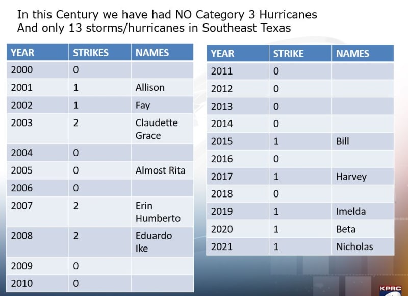 What is even more remarkable to me is that we honestly do not get tropical storms or hurricanes that often, so these are difficult predictions at best. I made a chart for you and you can see that since 2000, we’ve only had 10 years with storms that came ashore. For most of us, TS Allison, Hurricane Ike and TS Harvey were the only three that will be forever memorable.