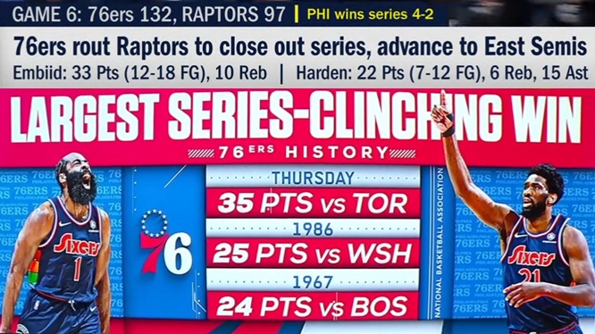 Led by Joel Embiid’s 33 PTS (12-18 FG), along with 10 REBS and 3 BLKS, the No. 4 seed Philadelphia 76ers defeated the No. 5 seed Toronto Raptors in Game 6, 132-97. James Harden added 22 PTS, 6 REBS and 15 AST for the 76ers in the victory, while Pascal Siakam tallied 24 PTS, 7 REB and 7 AST for the Raptors. After closing out this best-of-seven First Round series, 4-2, the 76ers will advance to the Eastern Conference Semifinals to face the Miami Heat.