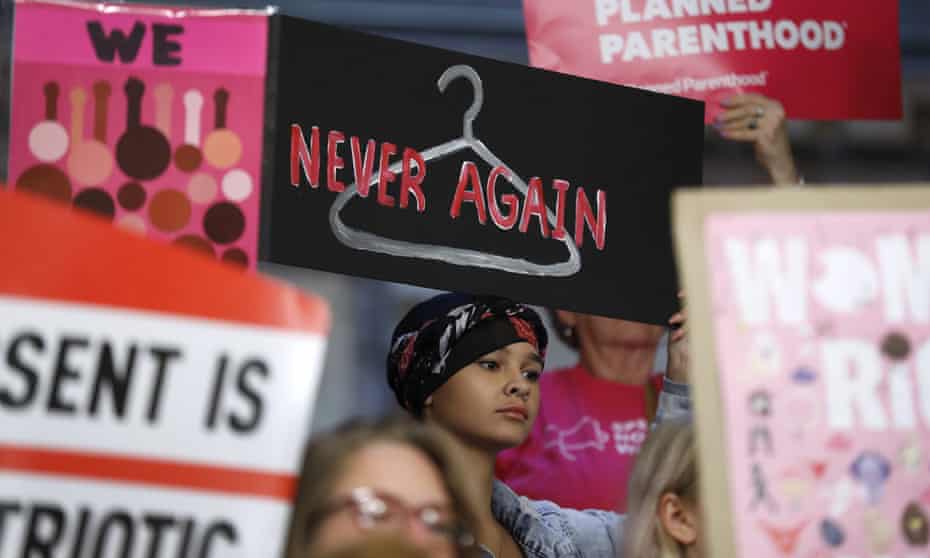 August Mulvihill, of Norwalk, Iowa, center, holds a sign during a rally to protest recent abortion bans, in Iowa on 21 May 2019. Photograph: Charlie Neibergall/AP