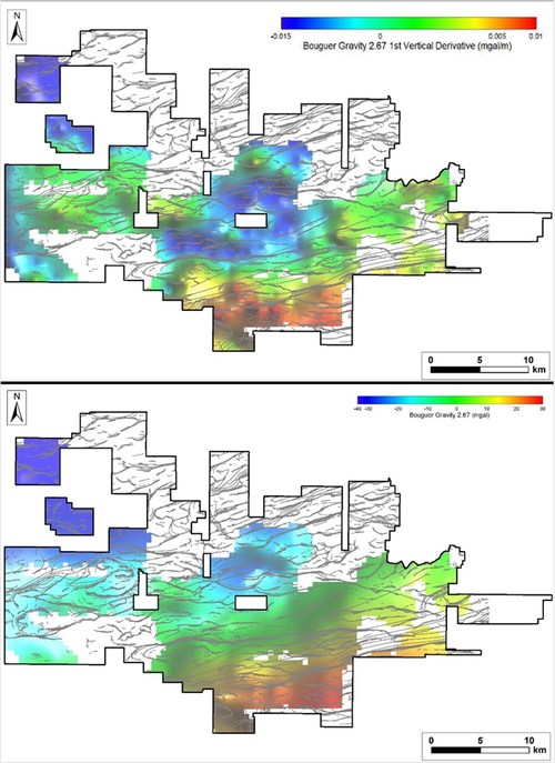 Figure 1. Terrain corrected Bouguer Gravity Residual Images, overlain by gradients defined in upward continuation modelling (“Worms”) of magnetic data. Top: Bouguer Gravity, first vertical derivative. Bottom: Bouguer Gravity, (CNW Group/Meridian Mining UK Societas) Highlights of today's announcement: