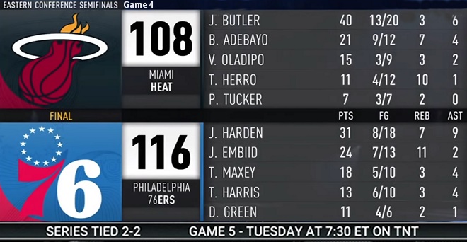 Led by James Harden’s 31 PTS, 7 REB and 9 AST, the Philadelphia 76ers defeated the Miami Heat in Game 4, 116-108. Joel Embiid added 24 PTS and 11 REB for the 76ers in the victory, while Jimmy Butler led all scorers with 40 PTS and 6 AST for the Heat. This best-of-seven series is now tied 2-2. Next Game » Miami Heat vs. Philadelphia 76ers - May 10 at 7:30pm/et on TNT.