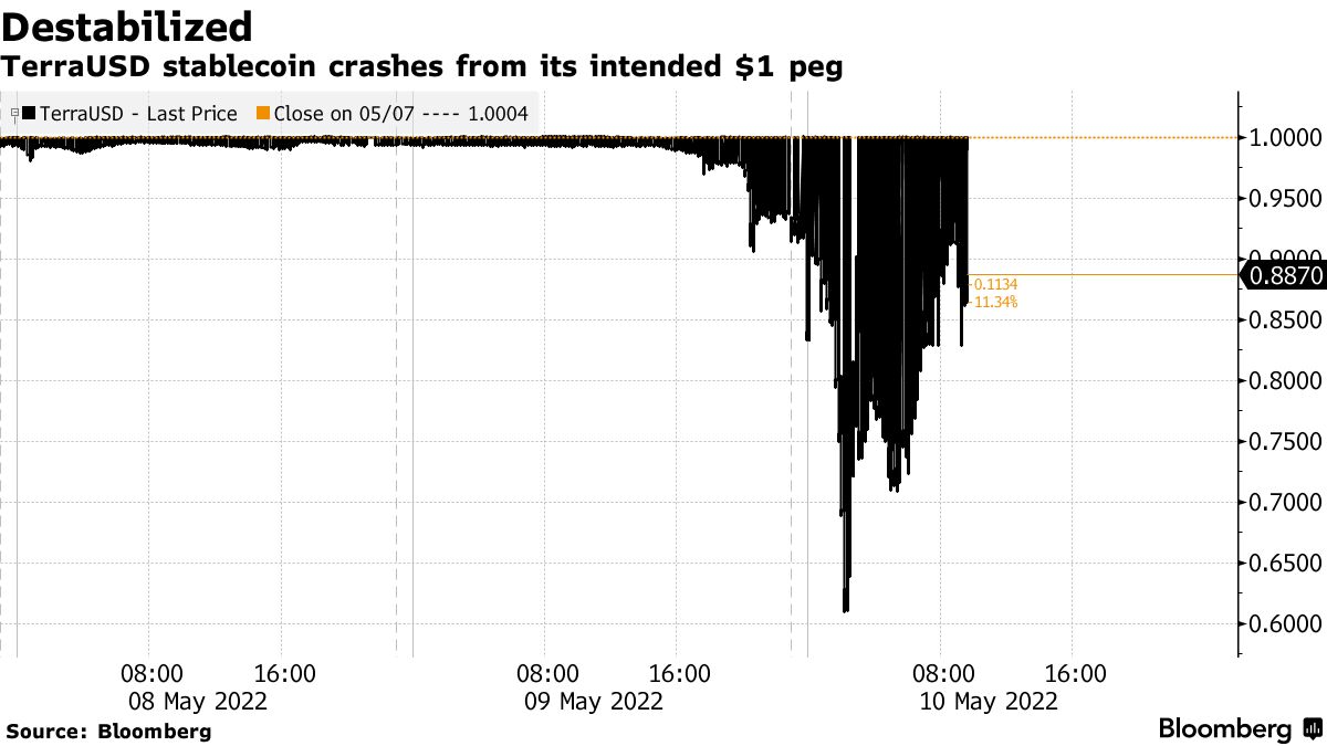 Rather than trading at $1, as designed, the TerraUSD coin, or UST, slipped over the weekend to around 99 cents. By Monday evening in New York, it had plunged to 60 cents, obliterating its previous low of 92 cents in May 2021. It clawed back some of its losses on Tuesday on to hover at around 90 cents -- still solidly below its dollar peg, though, and a sign of trouble.
