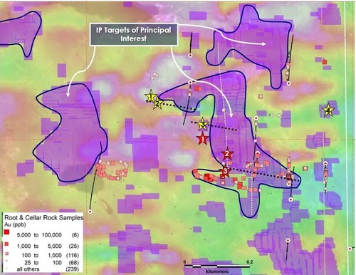 As announced in the Company news release dated April 20, 2022, exploration at Root & Cellar was focussing on the prospecting and ground-truthing of near-surface IP geophysical anomalies identified from the refined IP model at the Conquest Zone (see Company news release dated February 24, 2022). Exploration at the Conquest Zone to date has successfully identified: