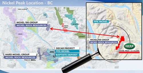 VANCOUVER, BC, June 7, 2022 /CNW/ - SKRR Exploration Inc. ("SKRR" or the "Company") (TSXV: SKRR) (OTC: SKKRF) (FSE: B04Q) is pleased to announce it has entered into a non-arm's length share purchase agreement dated June 6, 2022 (the "Share Purchase Agreement") to acquire all of the issued and outstanding shares of 1364991 B.C. Ltd., which owns a 100% interest in the Nickel Peak 1 and Nickel Peak 2 claim blocks (the "Nickel Peak Group") located north of the Decar Nickel project of FPX Nickel Corp. (TSXV: FPX), an advanced project targeting awaruite, a nickel-iron alloy mineral, hosted by serpentinized ultramafic intrusive rocks of the Trembleur ultramafic unit.