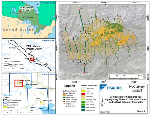 SUDBURY, ON, June 7, 2022 /CNW/ - Frontier Lithium Inc. (TSXV: FL) (FRA: HL2) (OTCQX: LITOF) ("Frontier" or "the Company") is pleased to announce the results from the drilling completed during the Phase XI drill program on the Spark pegmatite. Phase XI drilling was completed in March 2022 with a total of 1,342.5m in five holes completed. The Spark pegmatite is one of the two delineated premium spodumene-bearing lithium deposits on the PAK Lithium Project.