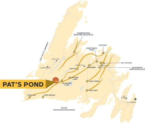 The 9,700 hectare Pat's Pond property is located less than 20 km from Marathon Gold's 3.14 Moz (56.7 Mt at 1.72 g/t Au) Valentine Gold Project1 and on trend with the Boomerang/Domino VMS deposit (4 kilometres to the northeast). The property is road accessible and is highly prospective for precious metal-rich volcanogenic massive sulphide mineralization and mesothermal gold.
