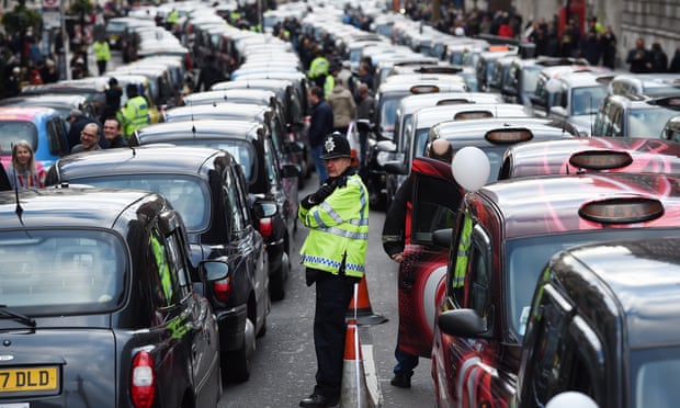 Taxis block Whitehall during a protest against a decision to grant Uber a licence to operate in London in 2016. Photograph: Andy Rain/EPA
