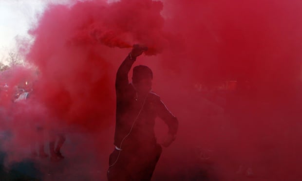 A demonstrator holds a flare during a Paris protest against Uber. Photograph: François Mori/AP