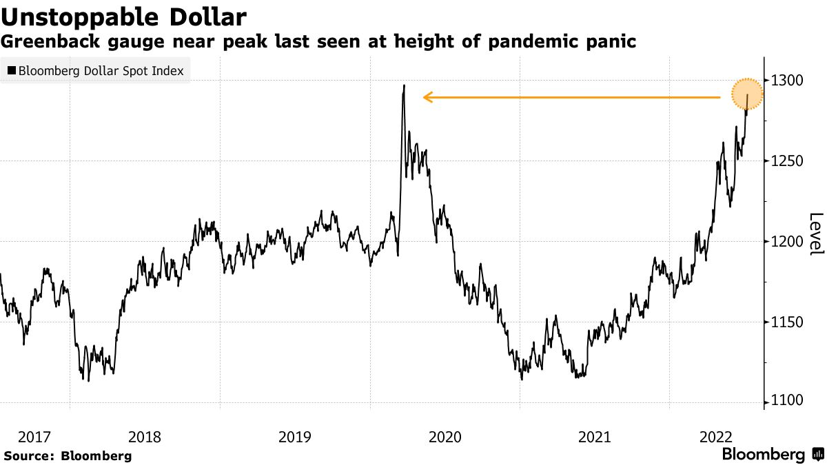 The dollar’s biggest jump in a month toward levels last seen at the height of the market panic over Covid underlined the caution in global markets. The euro-area’s common currency is closing in on parity with the greenback due to the intensifying gas crisis and acute recession fears in the region.