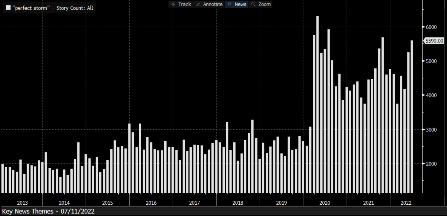In fact, there’s been a surge in mentions of ‘perfect storm’ in news articles more generally, spiking when the pandemic first hit and remaining elevated ever since. And on Wall Street, it’s a cliched incantation used by money managers to describe one of the worst quarters for many asset classes.