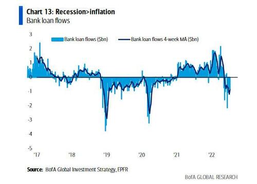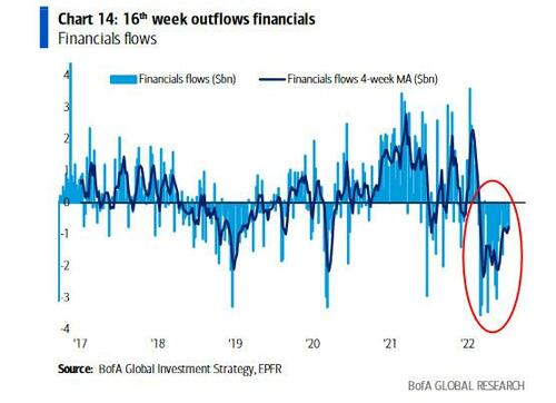 ... as investors dumped inflation-sensitive assets, i.e. - the largest 5-week outflow bank loans since Apr’20 ($5.6bn), outflows from IG/EM/HY, 16th week outflows financials ($0.8bn)...
