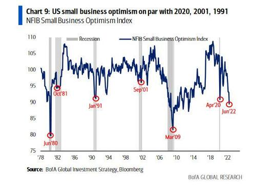 ... as charts increasingly point (as does yield curve) to hard rather than soft recession... US small business optimism currently on par with recession levels in 2020, 2001, 1991...