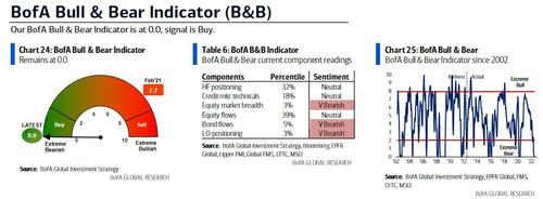 Hartnett next look at both weekly (15.1bn to cash, $1.6bn to bonds, $0.9bn from gold, $2.9bn from stocks) and annual fund flows, where he notes that YTD we have seen +$181bn into stocks, vs $206bn out of bonds and cash outflows of $199bn, or as Hartnett puts it, "everyone bearish stocks but few have sold" an observation further validated by the fact that the Bank of America Bull and Bear indicator remains for yet another week at the lowest on record: 0.0.