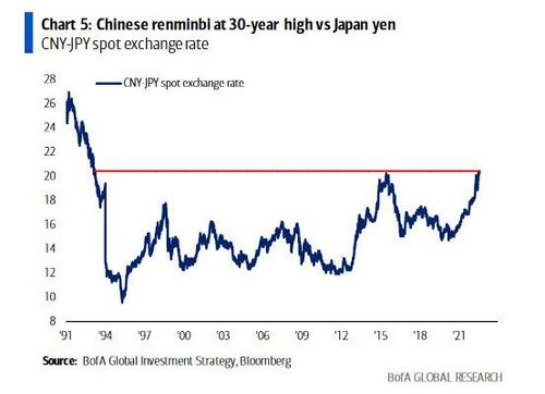 But an even bigger Q3 risk-off surprise is Asia FX war (as we first said in March in " Yen At Risk Of "Explosive" Downward Spiral With Kuroda Trapped... And Why China May Soon Devalue"). Indeed, China's renminbi is now at a 30-year high vs Japan yen...