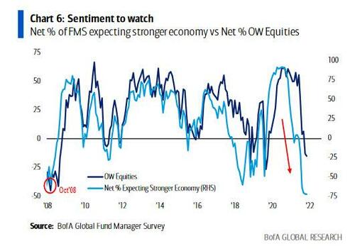 Which is also why Hartnett took a stab at one of our biggest peeves: the complete disconnect between the "residual equity allocation optimism" in the Fund Manager Survey and the dire economic and market pessimism, and whether these two series will ever catch up (or rather catch down).