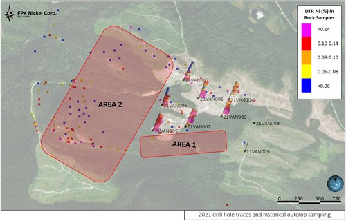 Area 1, which extends up to 500 m south of the 2021 holes, has been selected to follow the trend of increasing grade and thickness to the south as observed in sections drilled during the 2021 program. Area 2, which extends up to 1 km west of the 2021 holes, has been selected to similarly follow the trend of increasing grade and thickness along strike to the west, as well as strong DTR nickel occurrences in outcrops to the southwest.