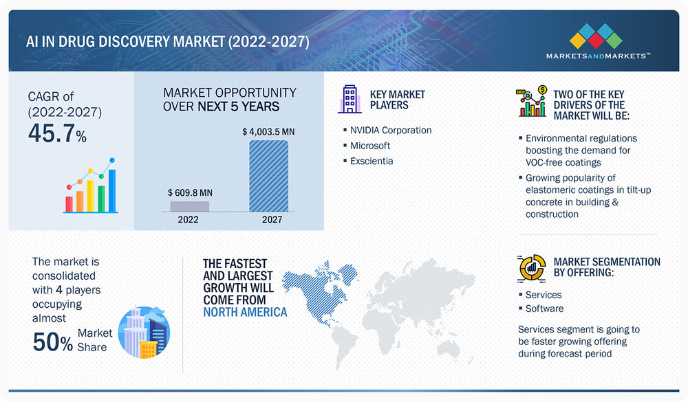 CHICAGO, July 28, 2022 /PRNewswire/ -- AI in Drug Discovery Market size is projected to reach USD 4.0 billion by 2027 from USD 0.6 billion in 2022, at a CAGR of 45.7% during the forecast period, according to the new recent study published by MarketsandMarkets™.