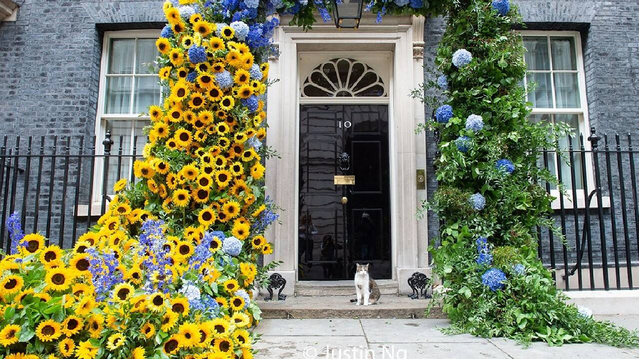 Here's 10 Downing Street decorated for Ukraine's Independence Day. Larry the cat approves...