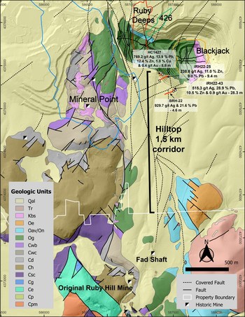 The Hilltop target is one of five conceptual exploration targets drilled in the 2022 program at Ruby Hill and was identified for its potential to host polymetallic (silver-lead-zinc) mineralization. The new zone of mineralization is located approximately 400 metres southwest of the poly-metallic Blackjack Zone (see Figure 1) and immediately south of the Archimedes pit and the planned portal that the Company is advancing for construction.