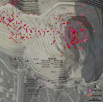 Mineralization in the Hilltop target consists of polymetallic carbonate replacement (CRD) in the form of massive and semi-massive sulphide mineralization containing high-grade silver (including 515.3 g/t Ag over 28.3 m & 929.7 g/t Ag over 4.6 m) and has been intersected in two areas within the Hilltop target (see Images 1 & 2). Definition and expansion drilling is underway, and the horizon remains open along strike and at depth. Mineralization has been intersected in additional holes 50 metres west of iRH22-43, for which assays remain pending.