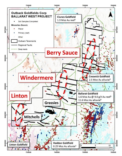 Figure 1. Map showing the Ballarat West tenement with soil samples collected to date and key areas of exploration focus (red dashed ovals). References below. (CNW Group/Outback Goldfields Corp.)