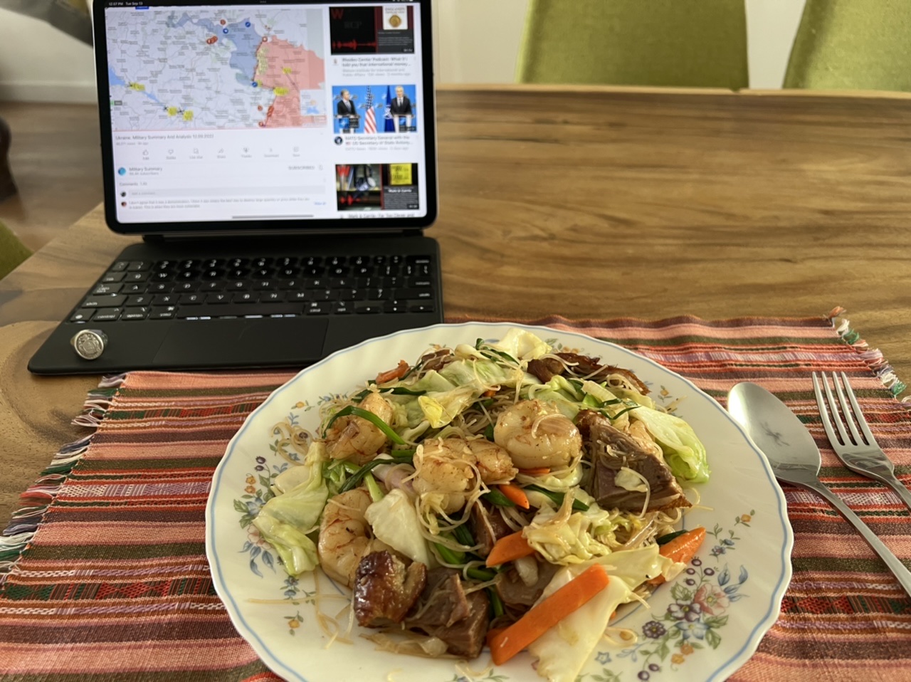 Good to be home. Lunch was a hash of leftover prawns and roast goose, and stir fried vermicelli and veggies.