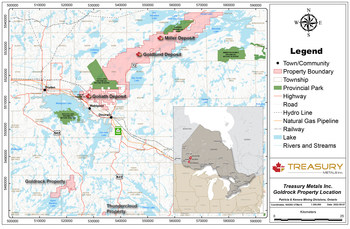 About Treasury Metals Inc. Treasury Metals Inc. is a gold focused company with assets in Canada. Treasury's Goliath Gold Complex, which includes the Goliath, Goldlund and Miller deposits, is located in Northwestern Ontario. The deposits benefit substantially from excellent access to the Trans-Canada Highway, related power and rail infrastructure, and close proximity to several communities including Dryden, Ontario. The Company also owns several other projects throughout Canada, including the Lara Polymetallic Project, Weebigee-Sandy Lake Gold Project JV, and grassroots gold exploration property Gold Rock. Treasury Metals is committed to inclusive, informed and meaningful dialogue with regional communities and Indigenous Nations throughout the life of all our Projects and on all aspects, including: creating sustainable economic opportunities, providing safe workplaces, enhancing of social value, and promoting community well-being.
