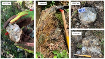 The prospecting team encountered favourable mineralization and veining in outcrops at Goldrock. Historically, mineralization in the Goldrock camp has been associated with quartz-veining in mafic to intermediate volcanic rocks within the shear zone footprint. In addition, sheared and altered volcanic rocks with sulphide mineralization (predominantly pyrite) has been associated with gold mineralization. The Treasury team encountered several locations with volcanics hosting up to metre-wide quartz veining with abundant euhedral pyrite mineralization (Figure 3). The areas with the most extensive shearing also showed strong silicification alteration with sulphide mineralization.